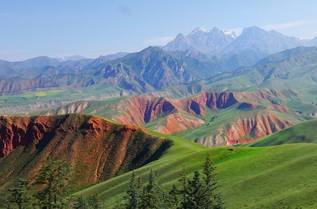 卓爾山 ·祁連山脈的一支,海拔4300m,屬丹霞地貌,緊靠八寶河,并與藏區(qū)神山牛心山隔河相望。 ·6-8月時草原翠綠欲滴,山體裸露處都是赤紅的砂巖,與碧綠的草原層疊交錯,景色壯美。 ·山脈兩側(cè)的林海、油菜花、村莊、縣城,景色層次感很強,是攝影師的最愛。